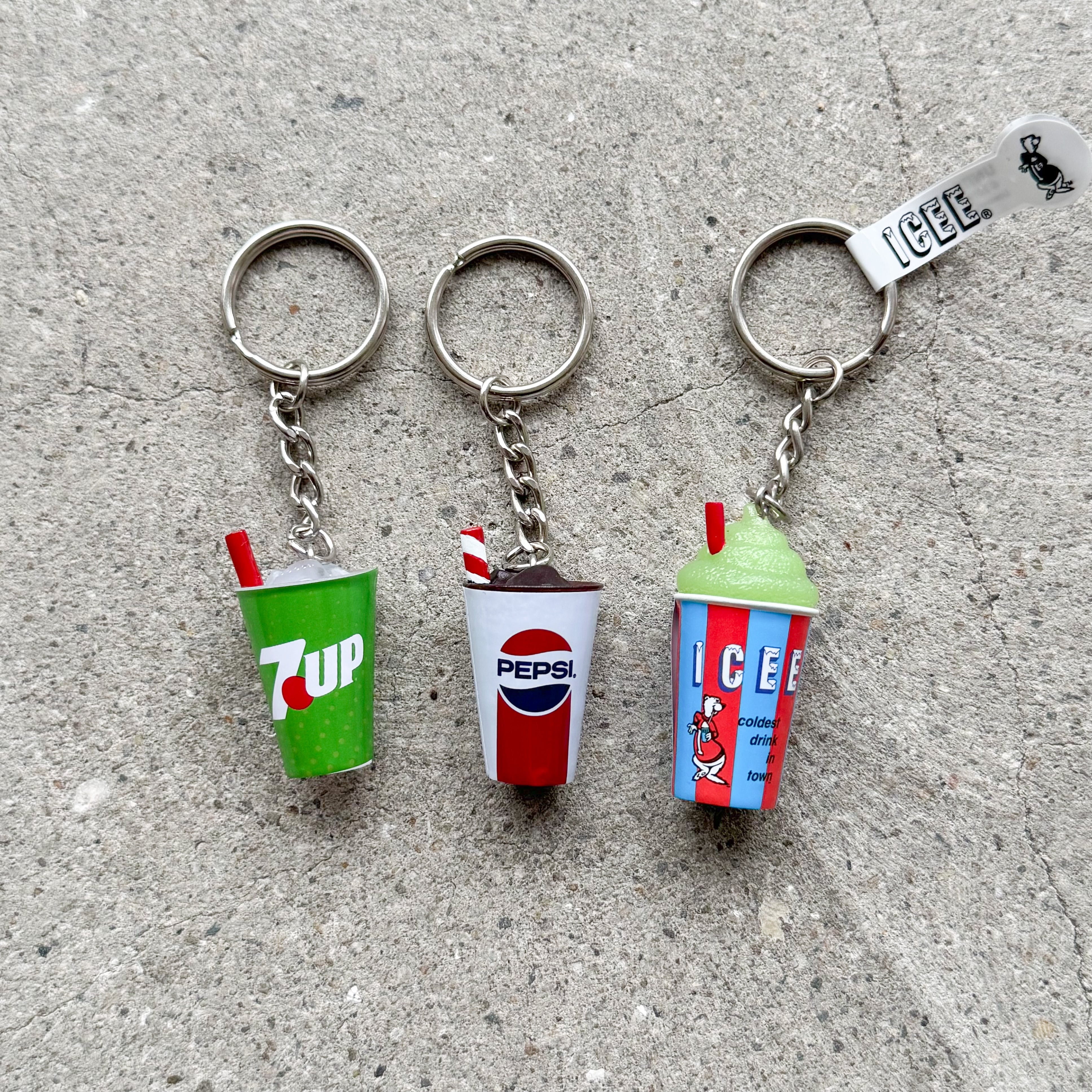 誰もが知るペプシコーラ、店主の好きな飲み物7UP、全米で愛されているフローズンドリンク「ICEE」のミニチュアキーリングです。