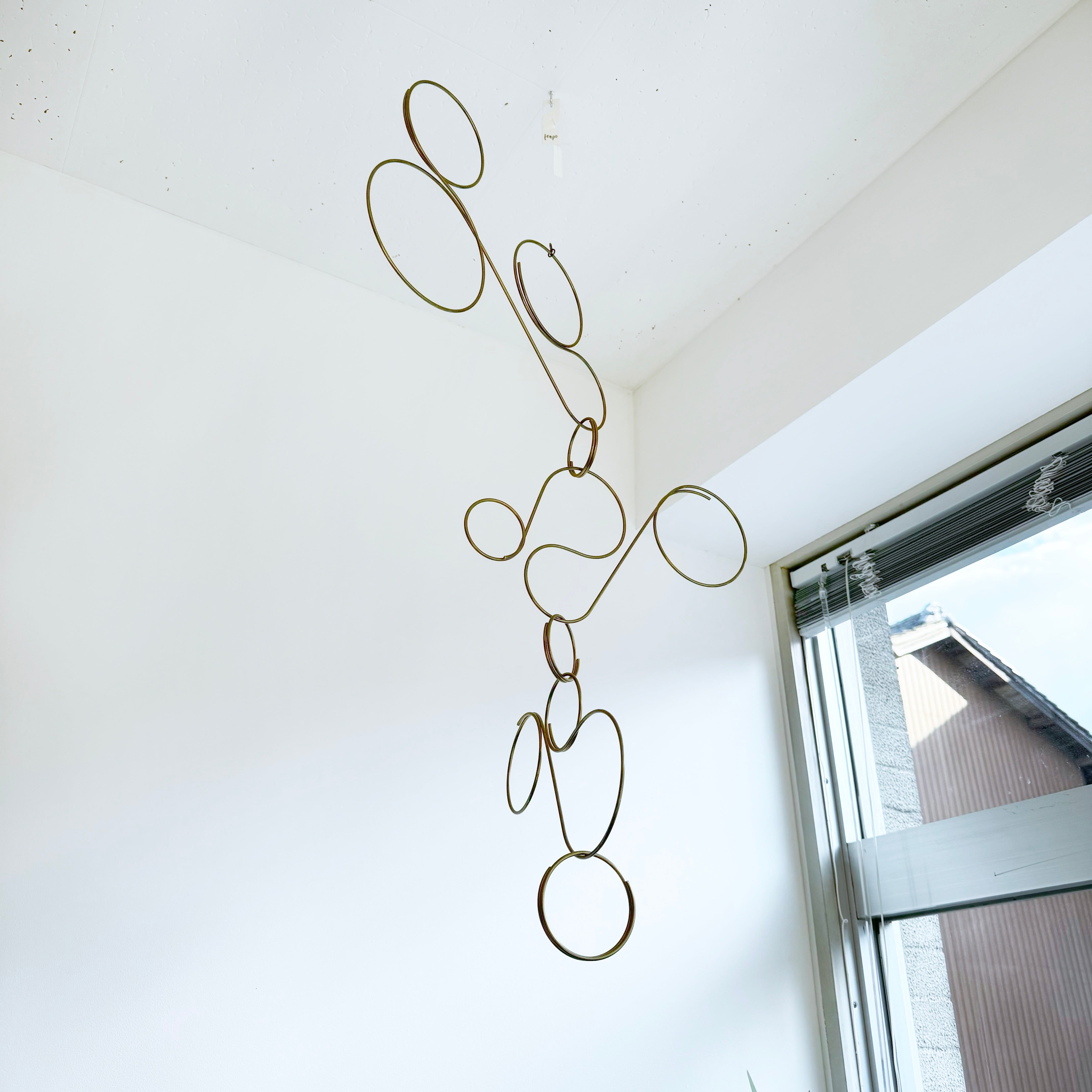 棒を曲げて連続した円を作り、それをリングで繋げた柔らかなイメージのモビールです。